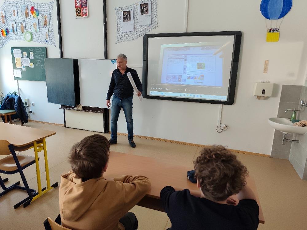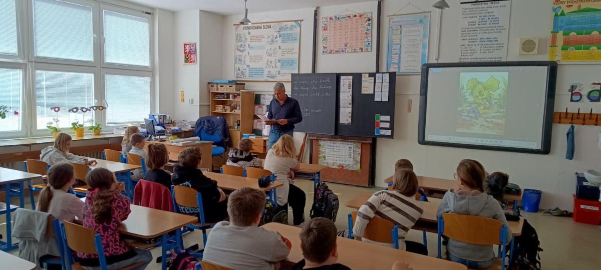 V druhém březnovém týdnu jsme na naší škole přivítali pana spisovatele Josefa Beneše. Pan Beneš navštívil několik tříd I. i II. stupně, aby s dětmi vedl besedu o vzniku knihy, a to nejen po stránce umělecké, tedy samotného napsání knihy, ale také z hlediska jejího vzniku.