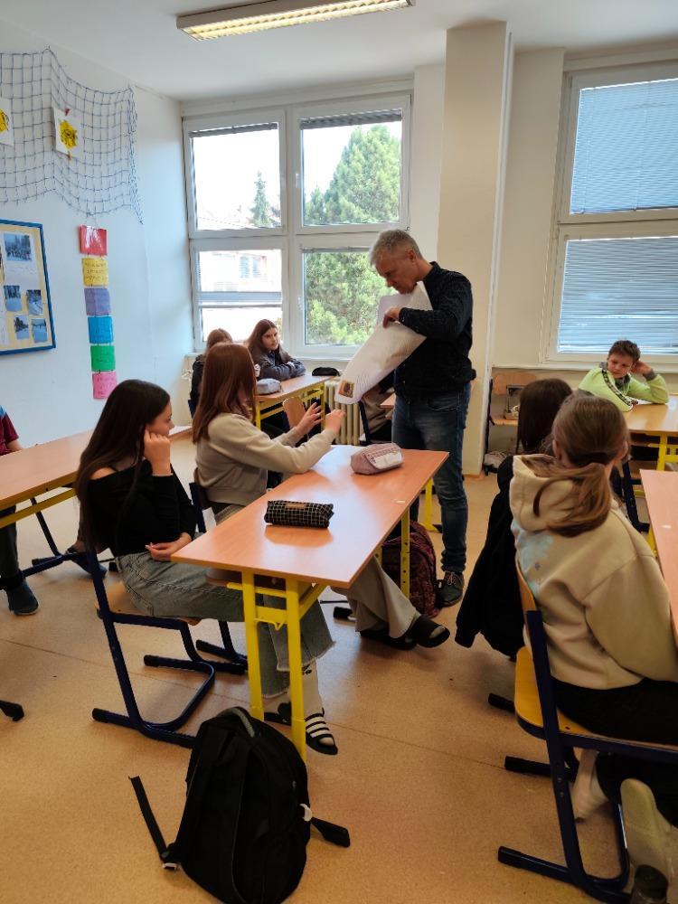 Žáci mohli klást dotazy, prohlédnout si návrhy ilustrací i vytištěných archů, které se následně skládají do knihy. Nezapomněli jsme pana spisovatele ani vyzpovídat pro náš školní časopis.