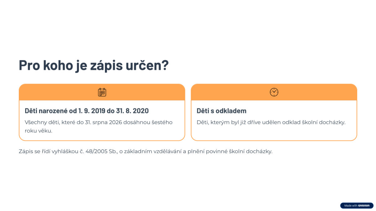 organizaci a průběh zápisu k povinné školní docházce určuje vyhláška č. 48/2005 Sb., o základním vzdělávání a některých náležitostech plnění povinné školní docházky, ve znění pozdějších předpisů.