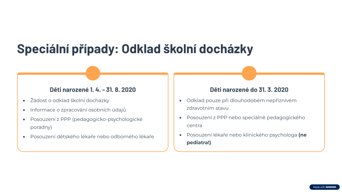 - Děti narozené do 31. 3. 2020: odklad lze udělit, pokud zdravotní stav dítěte dlouhodobě neumožňuje jeho účast ve vyučování. Kromě dokumentů pod bodem 1–3 výše je třeba ještě doložit: