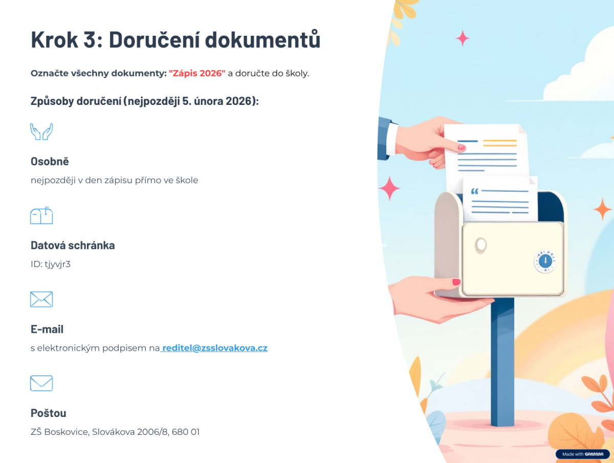 - poštou na adresu: Základní škola Boskovice, Slovákova, příspěvková organizace, Slovákova 2006/8 680 01 Boskovice