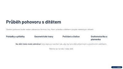 Osobní pohovor paní učitelky s dítětem bude zaměřen na pohádku, geometrické tvary, počítaní prvků a číslice, porovnávání, grafomotoriku, zrakovou diferenciaci, slabiky, určení první hlásky, písmenka, která znají nebo mají ve jméně. Vše bude vedeno zábavnou formou hry. Na děti čeká i malá odměna.