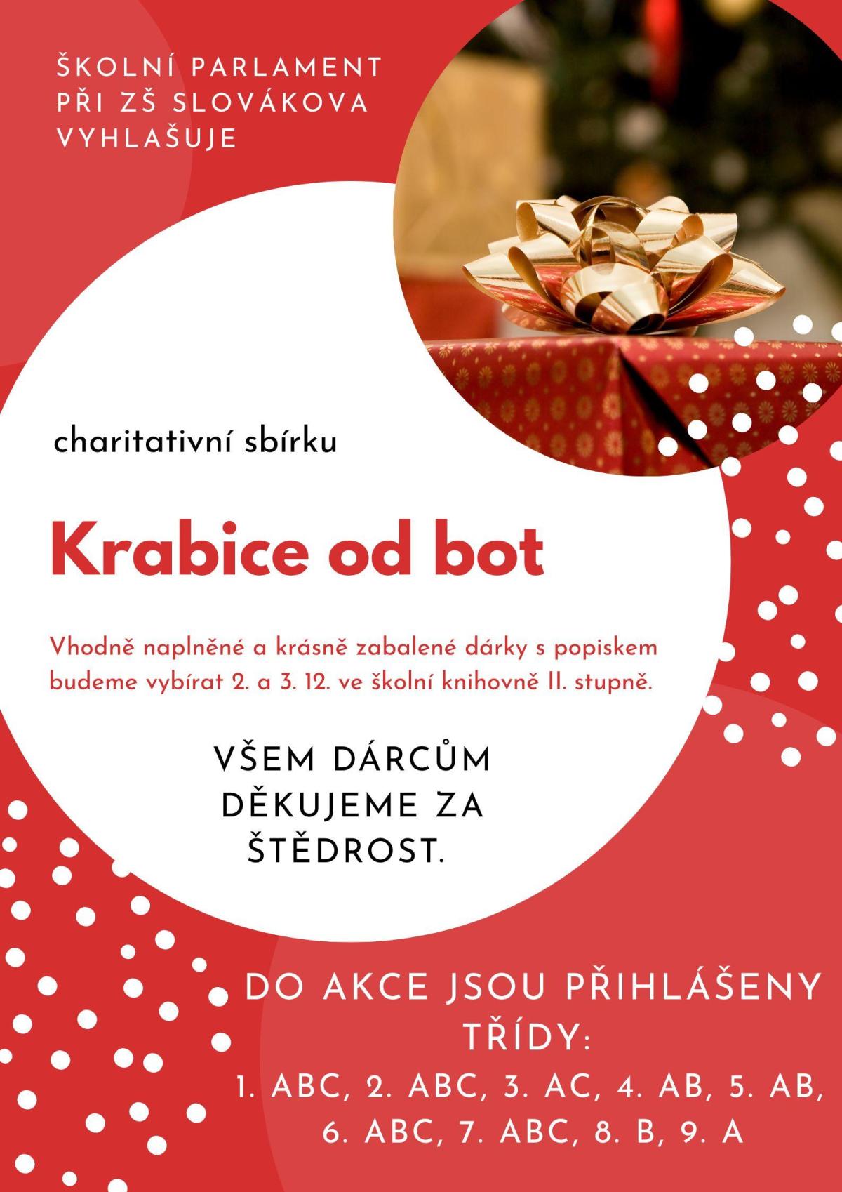 Už začátkem listopadu vyhlásil Školní parlament možnost zapojit se do charitativní sbírkové akce pro potřebné Krabice od bot. Opět se snesla velká vlna solidarity a do akce se zapojila většina tříd naší školy.