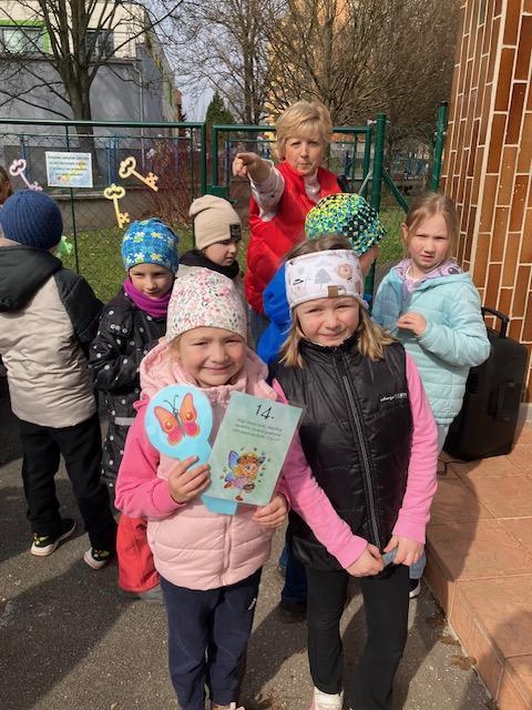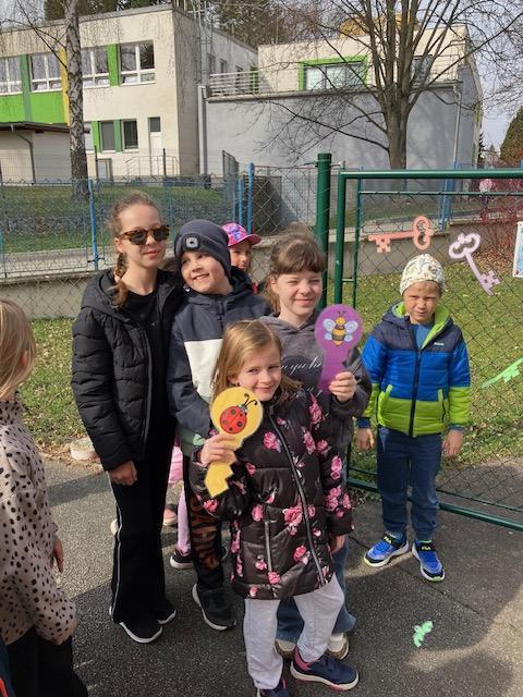 Samotnému odemykání ale předcházel úkol – jarní víla Květuška poztrácela v okolí školy 15 klíčů a bylo na dětech, aby ve skupinkách vyluštily 15 hádanek a poté vyhledaly a přinesly klíče s obrázky správných odpovědí. Šest klíčů v barvách našich družinek jsme pak použili ke slavnostnímu odemčení naší zahrady. Radost to byla veliká! Společně jsme pak broučkům řekli probouzecí básničku, která jim oznámila, že už můžou vyskočit ze svých postýlek a hřát se na sluníčku stejně jako my.