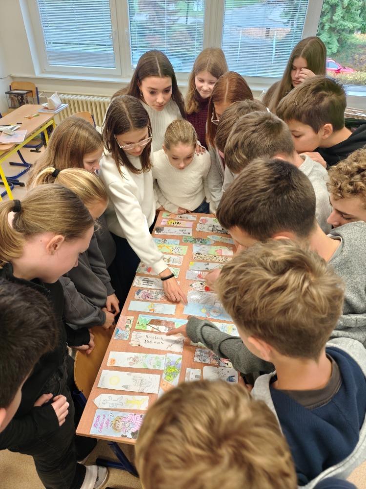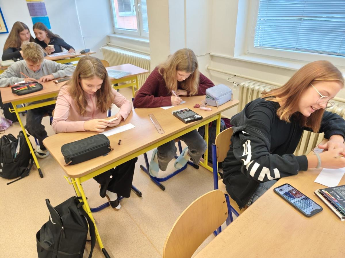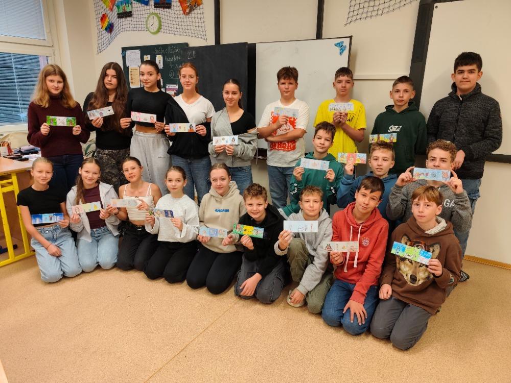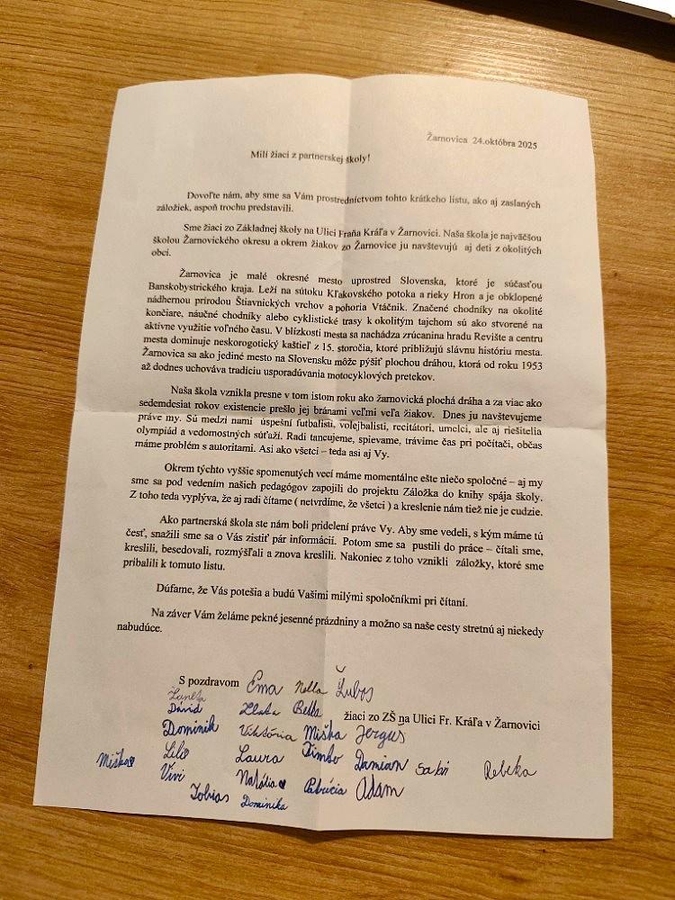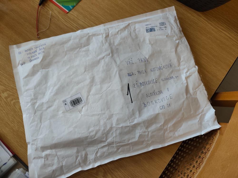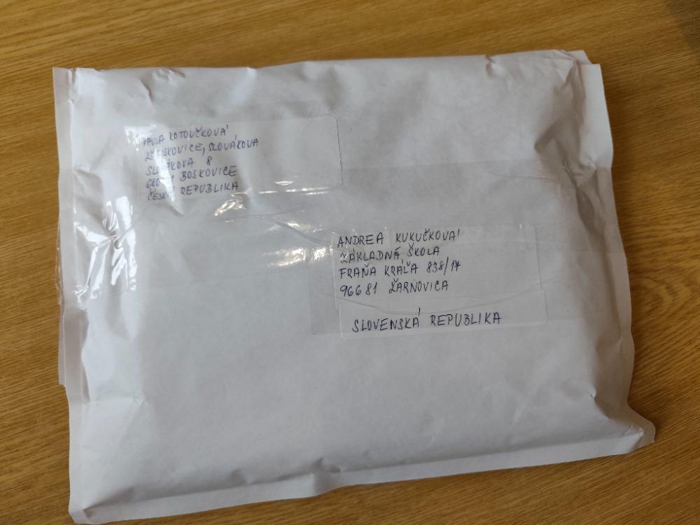 K záložkám jsme také připojili dopis, v němž jsme slovenským kamarádům z přidělené ZŠ Žarnovica představili naše město i školu a pozvali jsme je do našich končin na výlet. Někteří žáci přidali také kontakty na různé chatovací platformy, aby se se slovenskými dětmi mohli spojit i v lákavém online světě. Do balíčku jsme vložili ještě několik letáků o Boskovicích a okolí a nezapomněli jsme ani na oblíbenou čokoládu.