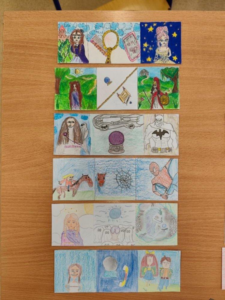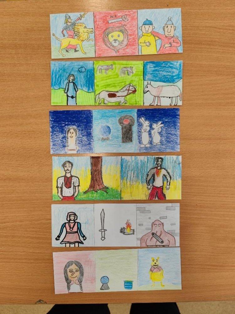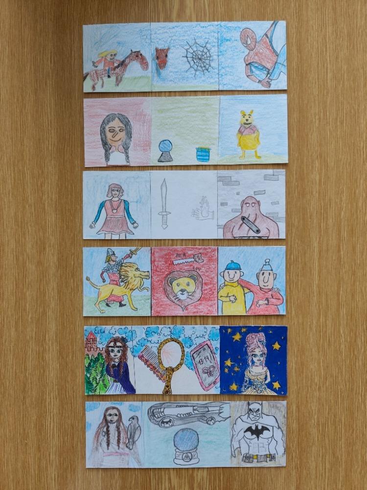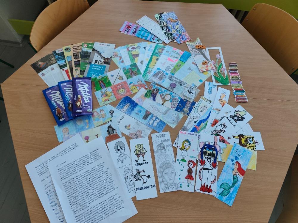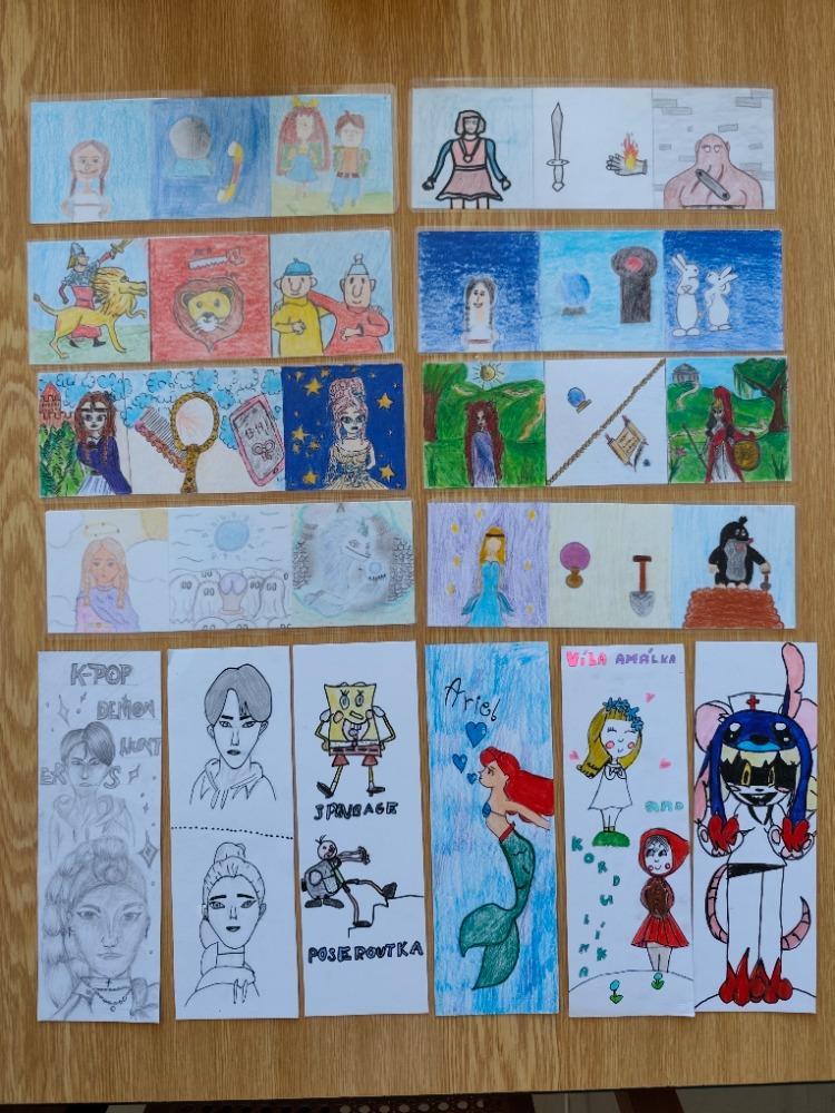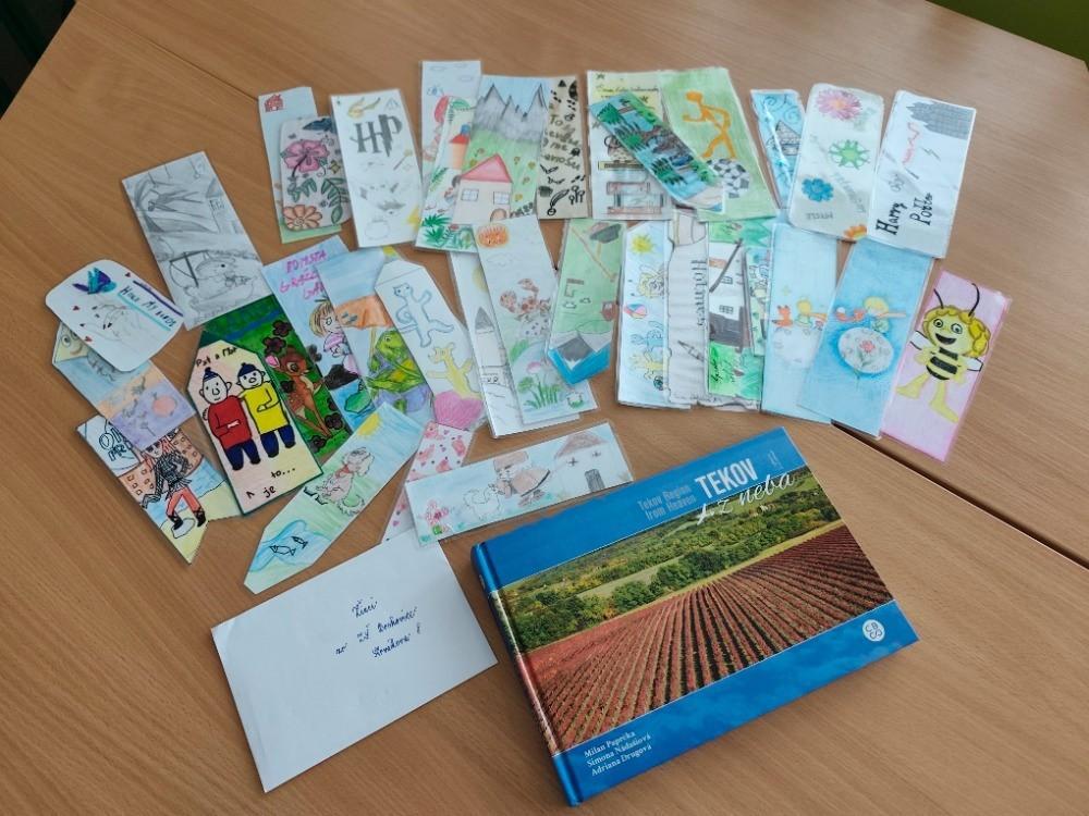 V akci, která má podpořit nejen čtenářství u dětí, ale také získání kontaktů a poznávání slovenského jazyka a kraje, vytváří žáci libovolnou technikou krásné záložky, které většinou navazují na práci se zajímavými texty. My jsme v rámci zadaného tématu fiktivně propojili známé postavy z našich starých českých pověstí s jiným literárním hrdinou a vymysleli, jaké dárky by si ze své knihy mohli vzájemně předat. A tak třeba Horymír dostal Spidermanovu moc tvořit pavoučí síť, čímž by mohl uchránit Šemíka od skoku z vyšehradské skály.