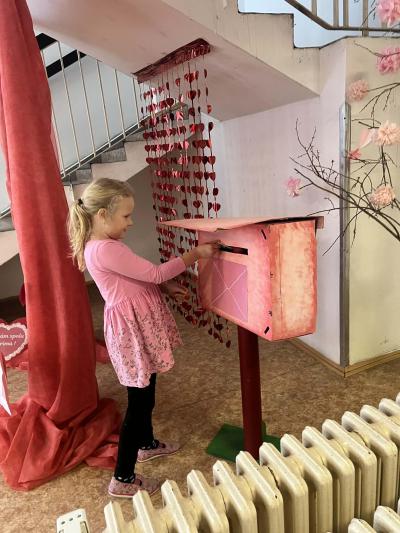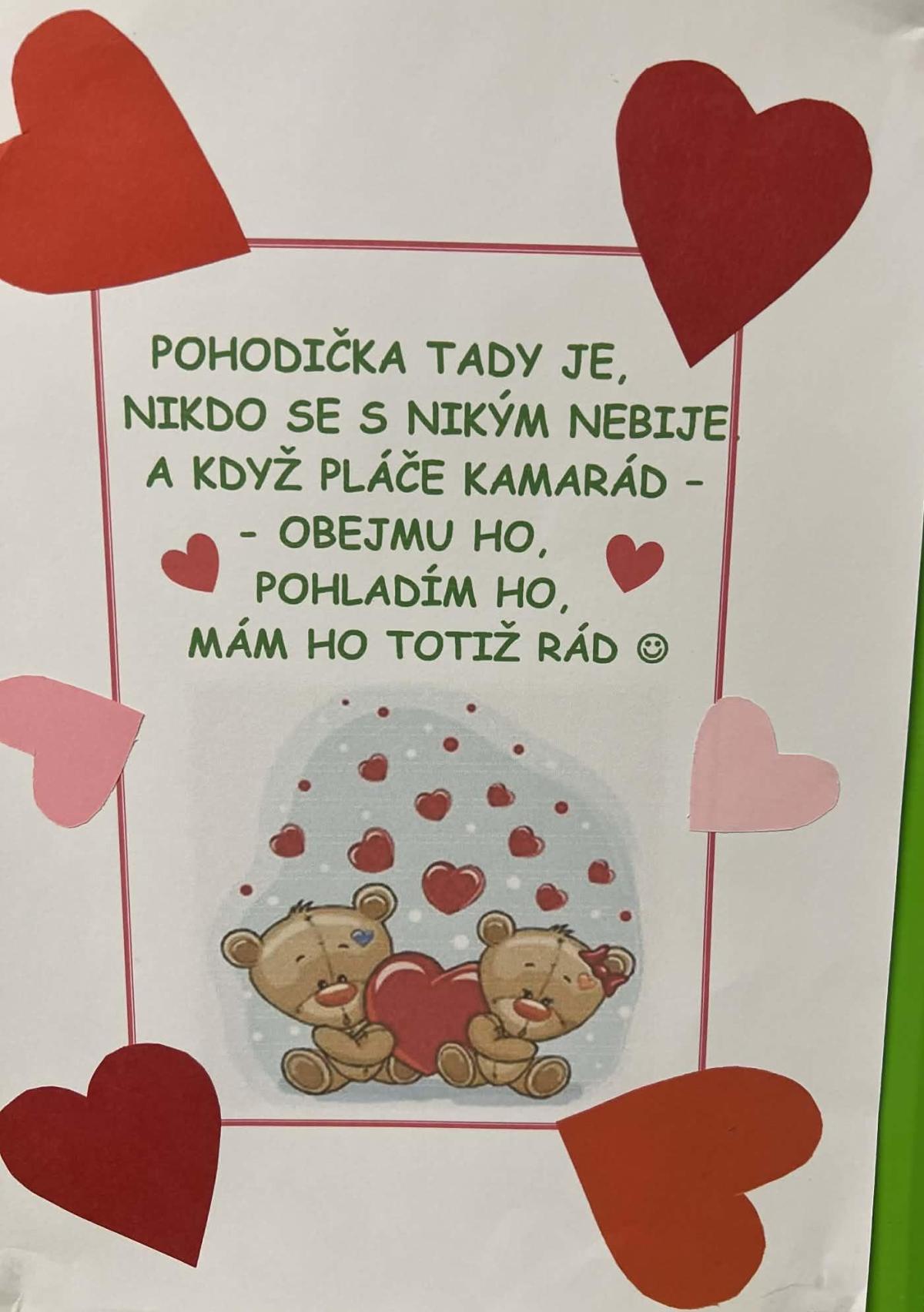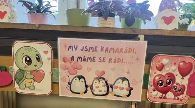 A tak jsme naše družinky převlékli do růžově srdíčkových kabátků, stejně tak chodbu a vestibul, v provozu je naše maxischránka na valentýnskou poštu, valentýnky kreslíme, píšeme, stříháme a lepíme a rádi si společně řekneme i básničky o kamarádství a také tom, že být na sebe hodní je prostě nejvíc.