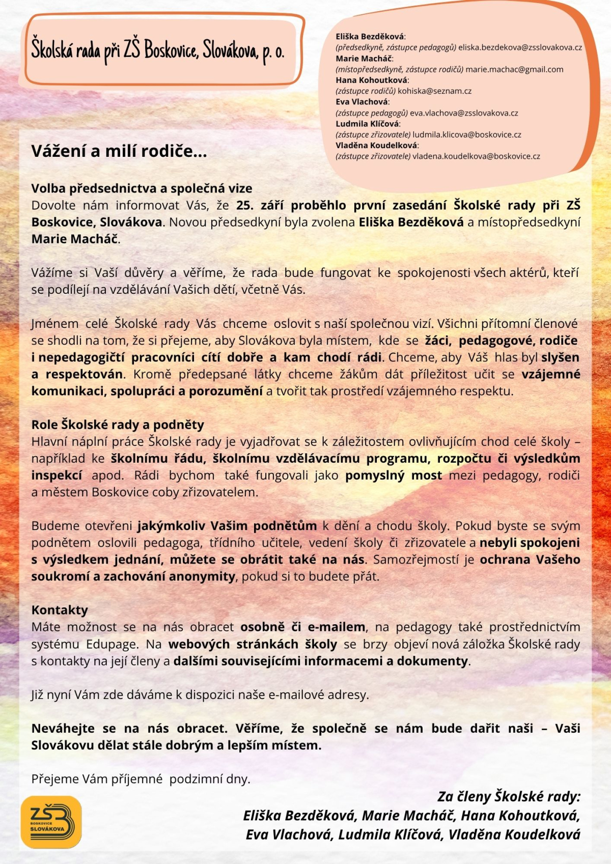 Mgr. Eliška Bezděková – předsedkyně ŠR, eliska.bezdekova@zsslovakova.cz