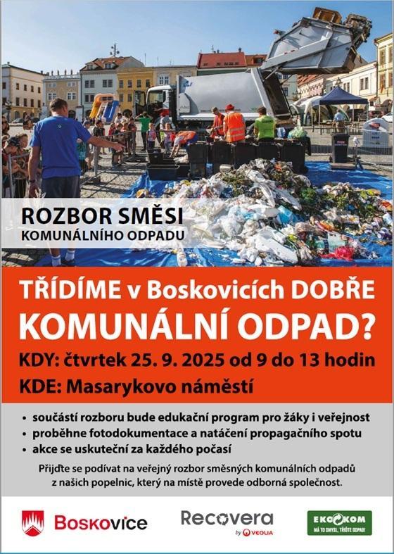 Akce „Odpadový den“ se uskutečnila ve čtvrtek 25. září 2025 na Masarykově náměstí v Boskovicích. Ve spolupráci se společnostmi EKO-KOM a Recovera proběhl v horní části náměstí ukázkový rozbor směsného komunálního odpadu. Akce se zúčastnili žáci 7. ročníku, kterým letošní školní rok přinese i další aktivity spojeny s projektem Náš životní styl.