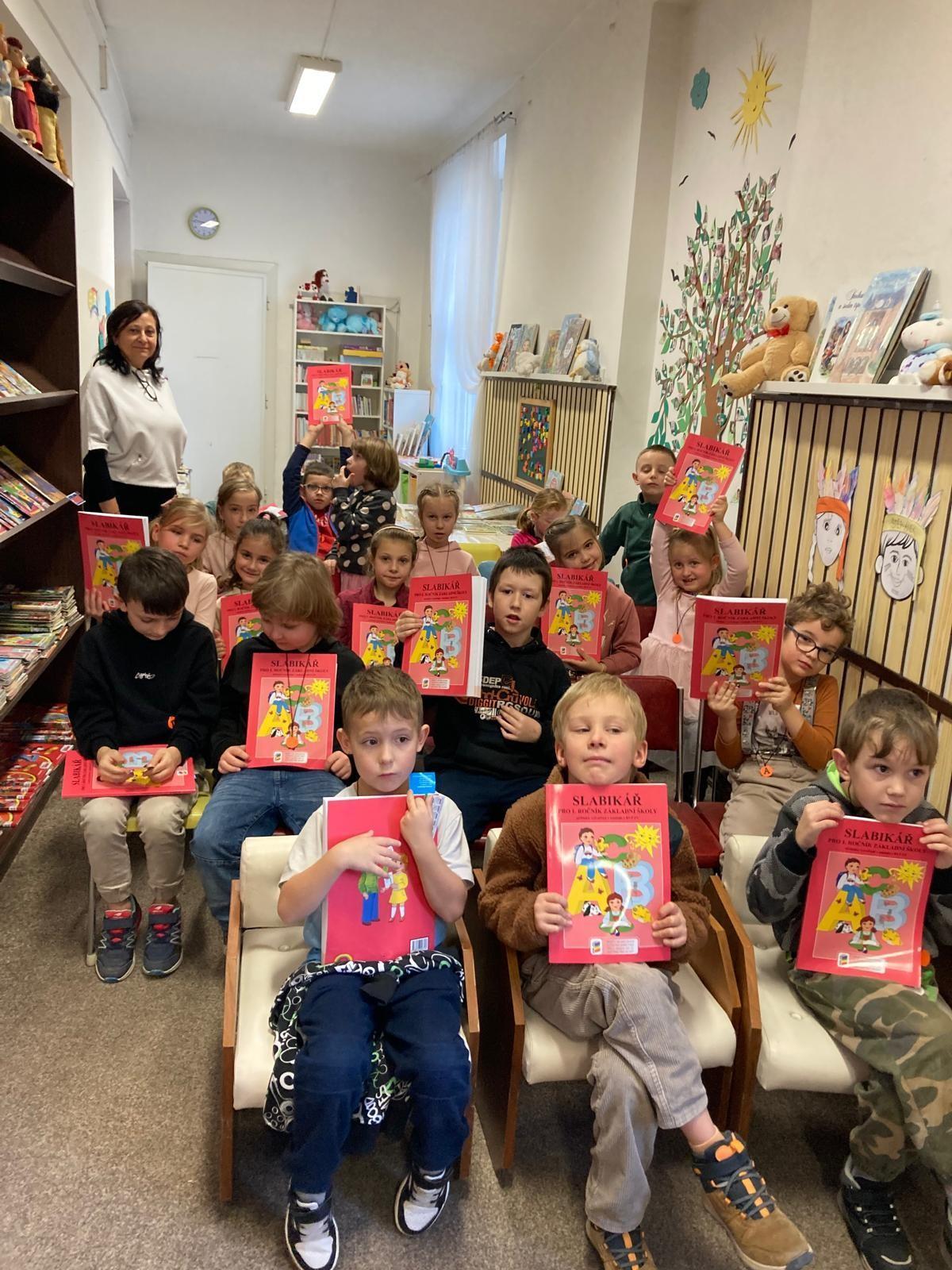 Minulý týden jsme vyrazili do knihovny, kde měly paní knihovnice připraven program s různými úkoly, seznámily děti s knihovnou a paní učitelky pak děti pasovaly na čtenáře a předaly jim jejich první knihu – Slabikář.