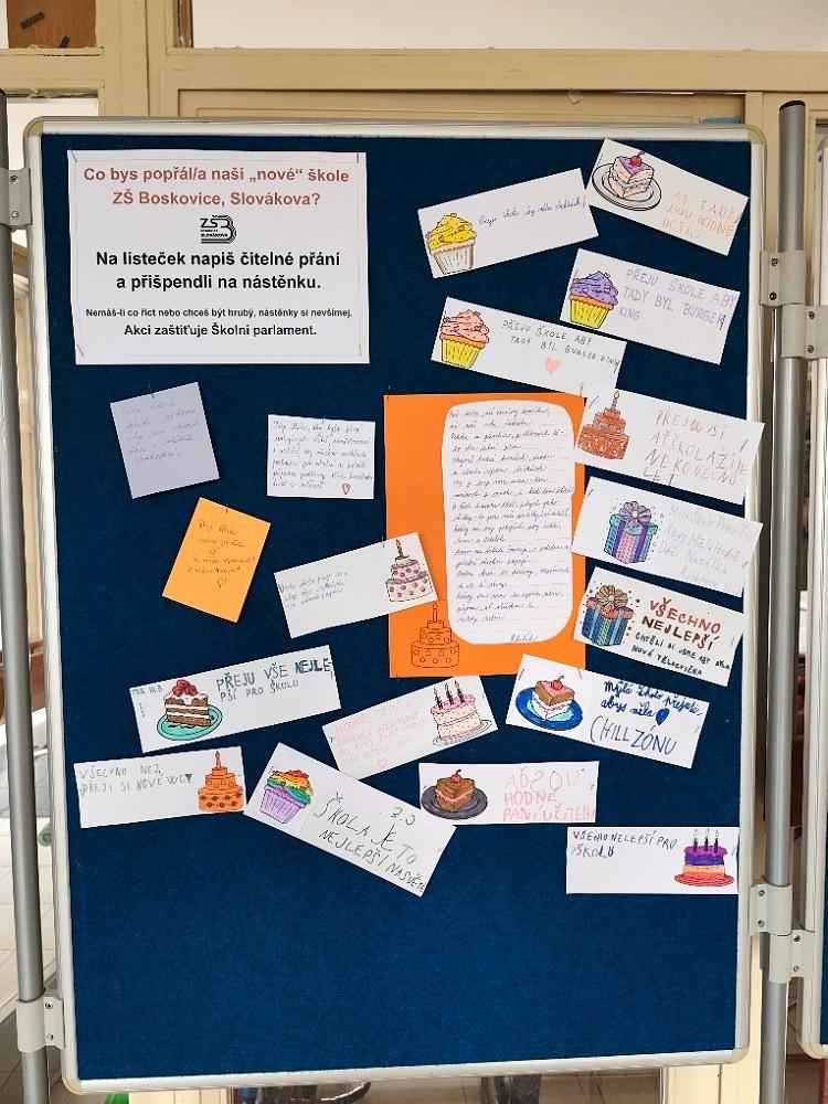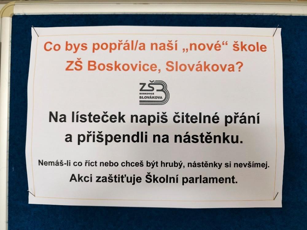 Školní parlament připravil jednu ze svých prvních letošních akcí – Přání naší škole. U hlavního vchodu jsme instalovali nástěnku, na niž je možné připíchnout přání, kterým bychom chtěli vyjádřit, co naší škole přejeme. Nyní stojíme na počátku něčeho nového, kdy je třeba vytýčit si směr, naplánovat cíle a začít na nich intenzivně pracovat. I proto budeme rádi, když svým přáním také naši žáci přispějí k další budoucnosti školy.